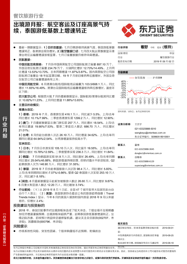 【东方证券】【20190902】出境游月报:航空客运及订座高景气持续,泰国游低基数上增速转正-16页
