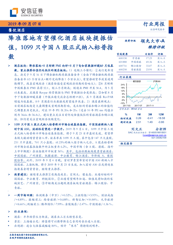 【安信证券】【20190907】餐饮酒店行业周报:降准落地有望催化酒店板块提振估值-18页