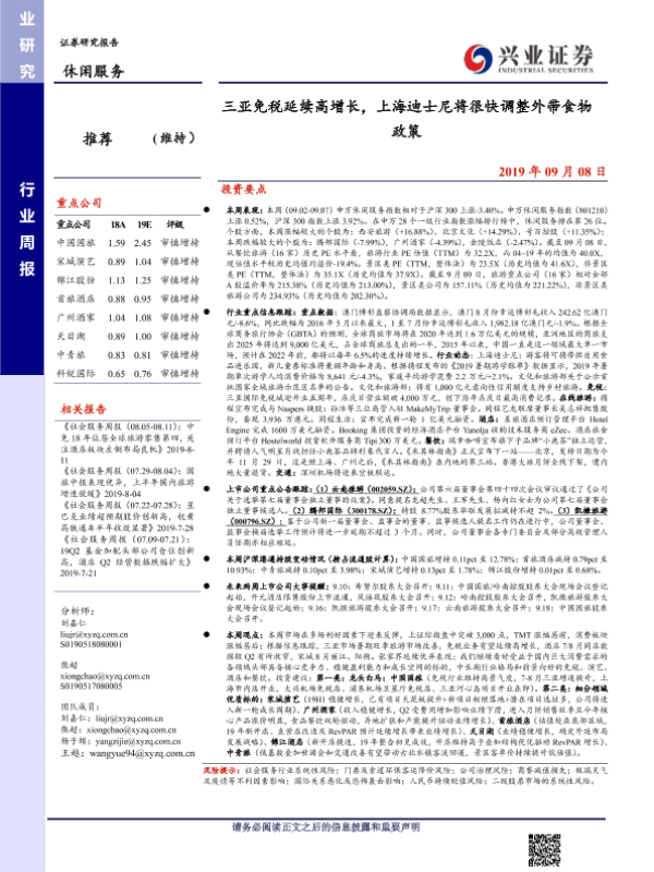 【兴业证券】【20190908】三亚免税延续高增长,上海迪士尼将很快调整外带食物政策-15页