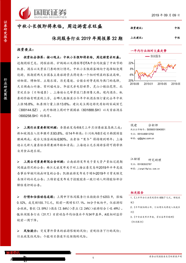 【国联证券】【20190909】休闲服务行业2019年周报第32期:中秋小长假即将来临,周边游需求旺盛-8页
