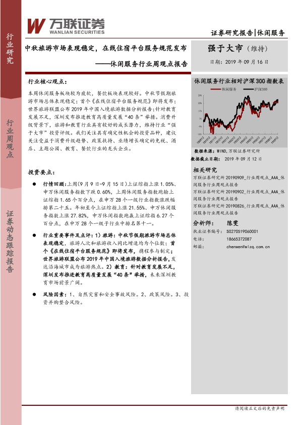 【万联证券】【20190916】休闲服务行业周观点报告:中秋旅游市场表现稳定,在线住宿平台服务规范发布-10页