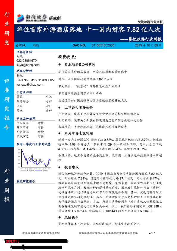 【渤海证券】【20191009】餐饮旅游行业周报:华住首家外海酒店落地 十一国内游客7.82亿人次-12页