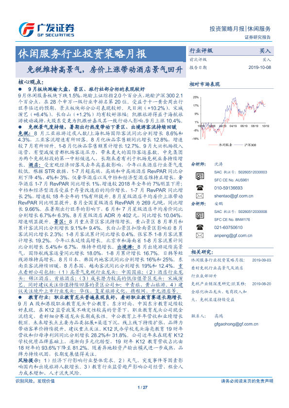 【广发证券】【20191008】休闲服务行业投资策略月报:免税维持高景气,房价上涨带动酒店景气回升-27页