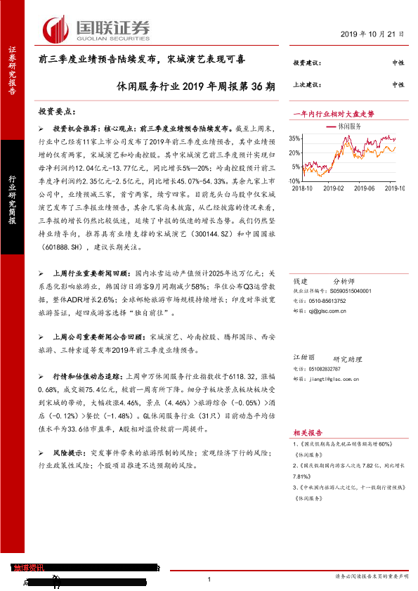 【国联证券】【20191021】休闲服务行业2019年周报第36期:前三季度业绩预告陆续发布,宋城演艺表现可喜-7页
