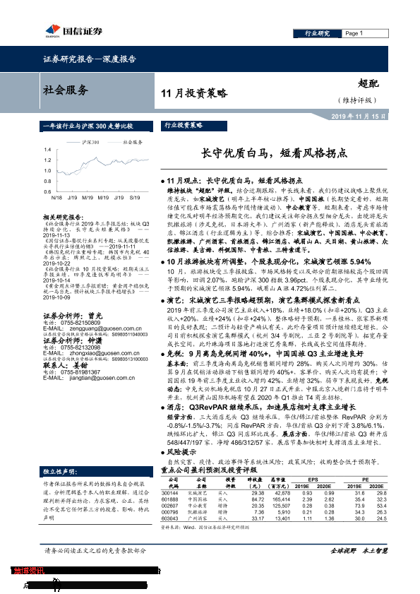 【国信证券】【20191115】社会服务行业11月投资策略:长守优质白马,短看风格拐点-14页
