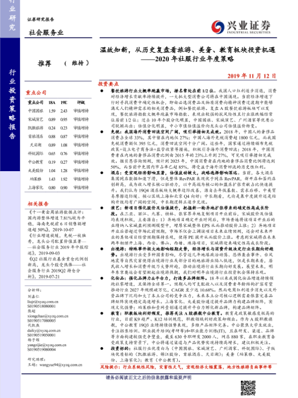 【兴业证券】【20191112】2020年社服行业年度策略:温故知新,从历史复盘看旅游、美奢、教育板块投资机遇-66页
