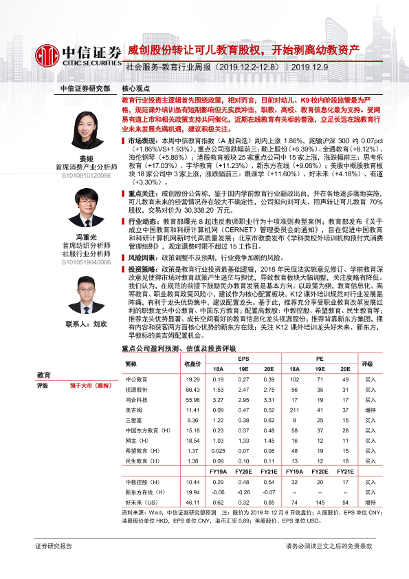 可儿教育 威创股份 幼教资产剥离 教育行业周报 股权转让