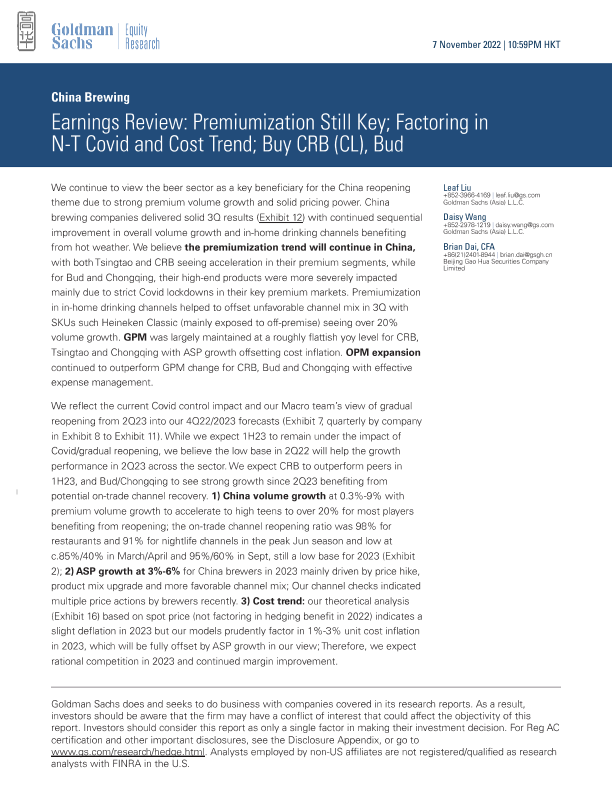 【Goldman Sachs】【20221107】Earnings Review Premiumization Still Key; Factoring in N-T Covid and Cost Trend; Buy CRB(CL), Bud-25页