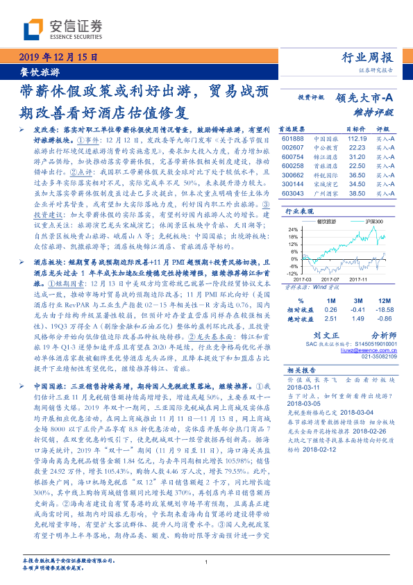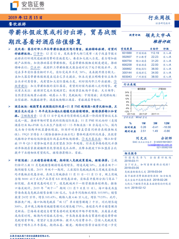 【安信证券】【20191215】餐饮旅游行业周报:带薪休假政策或利好出游,贸易战预期改善看好酒店估值修复-18页