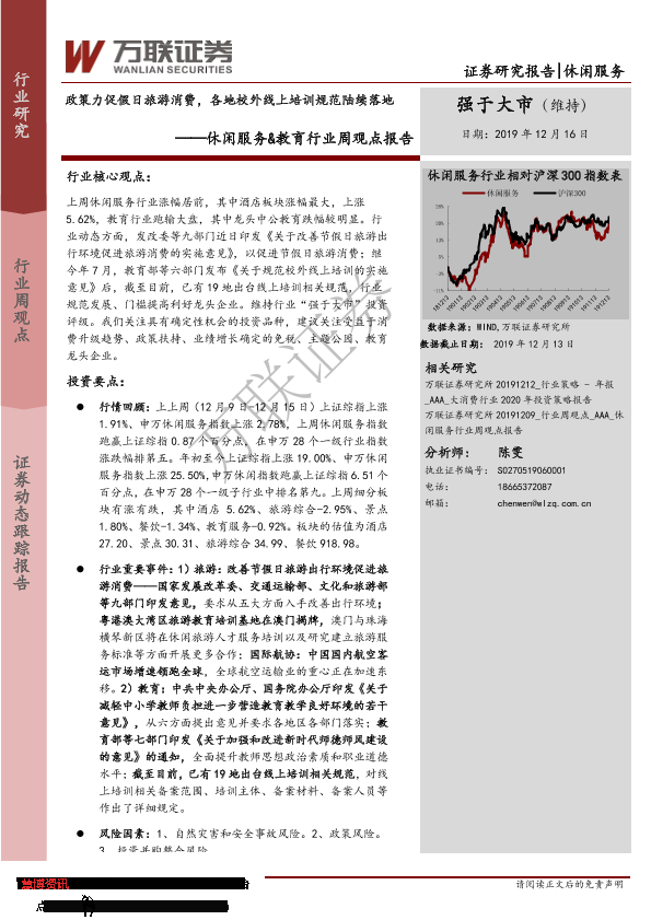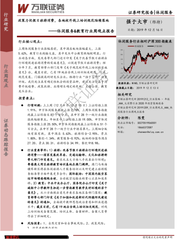 【万联证券】【20191216】休闲服务&教育行业周观点报告:政策力促假日旅游消费,各地校外线上培训规范陆续落地-9页