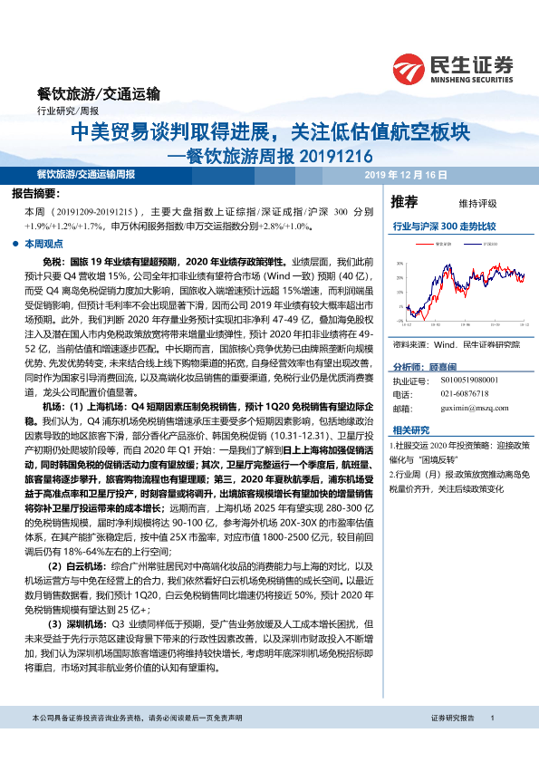 【民生证券】【20191216】餐饮旅游周报:中美贸易谈判取得进展,关注低估值航空板块-14页