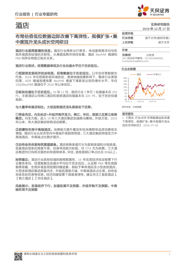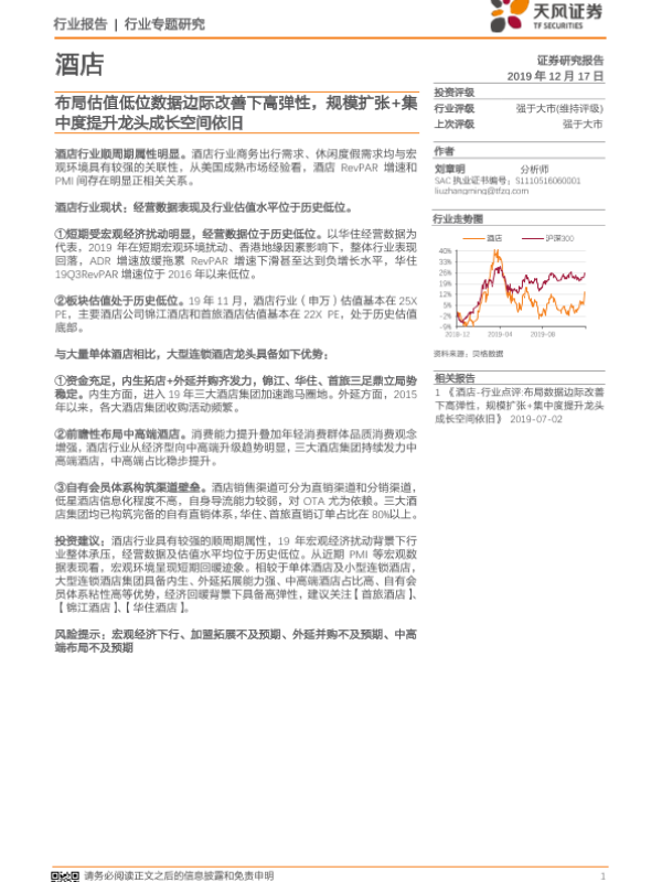 【天风证券】【20191217】酒店行业专题研究:布局估值低位数据边际改善下高弹性,规模扩张+集中度提升龙头成长空间依旧-7页
