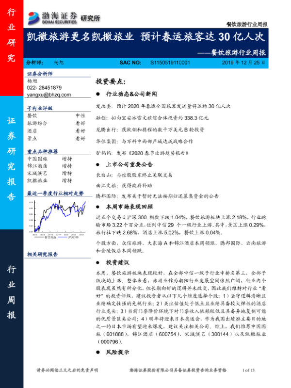 【渤海证券】【20191225】餐饮旅游行业周报:凯撒旅游更名凯撒旅业 预计春运旅客达30亿人次-13页
