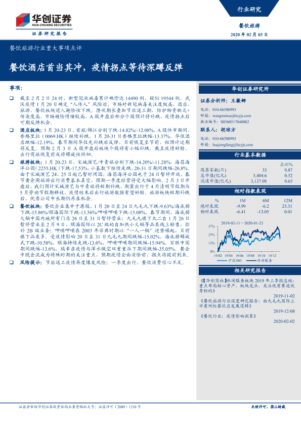 【华创证券】【20200203】餐饮旅游行业重大事项点评:餐饮酒店首当其冲,疫情拐点等待深蹲反弹-9页