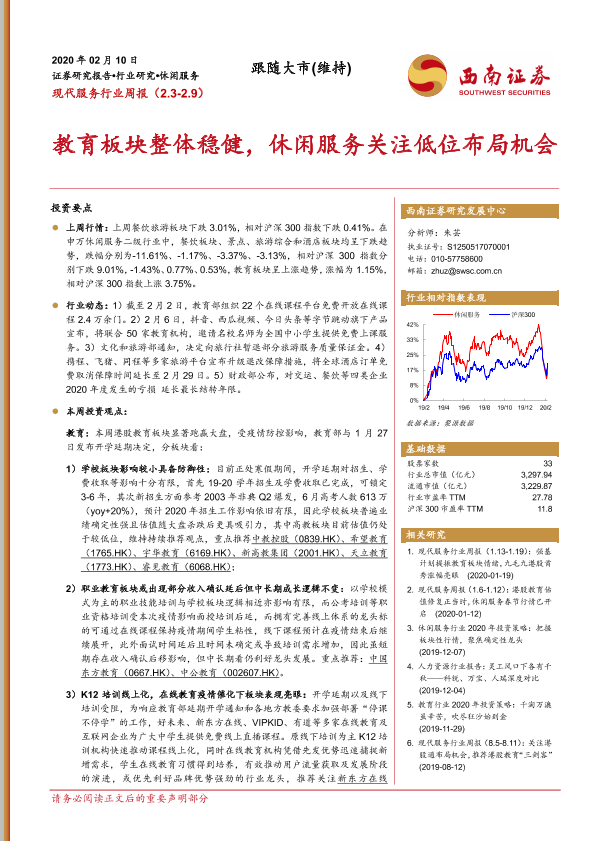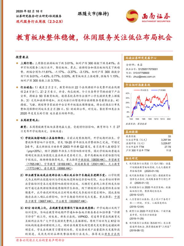 【西南证券】【20200210】现代服务行业周报:教育板块整体稳健,休闲服务关注低位布局机会-11页