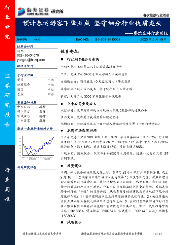 【渤海证券】【20200219】餐饮旅游行业周报:预计春运游客下降五成 坚守细分行业优质龙头-13页