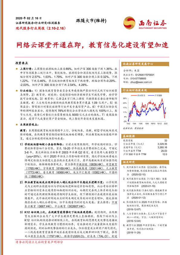 【西南证券】【20200216】现代服务行业周报:网络云课堂开通在即,教育信息化建设有望加速-12页