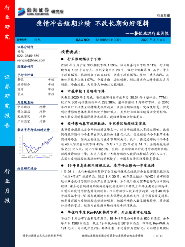 【渤海证券】【20200304】餐饮旅游行业月报:疫情冲击短期业绩 不改长期向好逻辑-13页