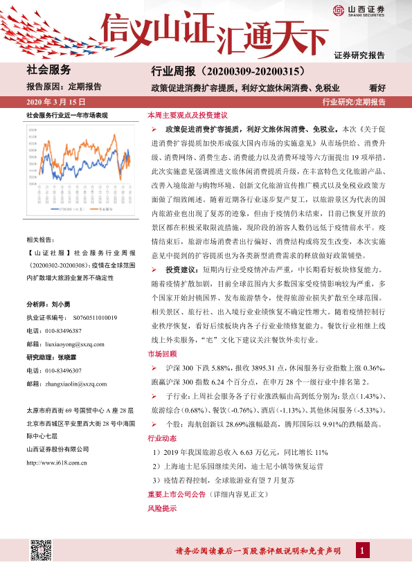 【山西证券】【20200315】社会服务行业周报:政策促进消费扩容提质,利好文旅休闲消费、免税业-9页