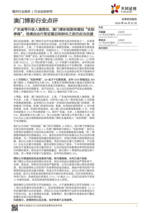 【天风证券】【20200401】广东省等升级入境管控,澳门博彩短期将重陷“实际停摆”,港澳自由行签证重启明朗化之前仍应当回避-9页