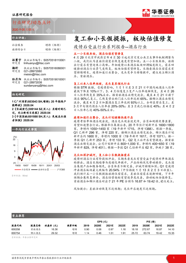 【华泰证券】【20200505】疫情后受益行业系列报告--酒店行业:复工和小长假提振,板块估值修复-3页