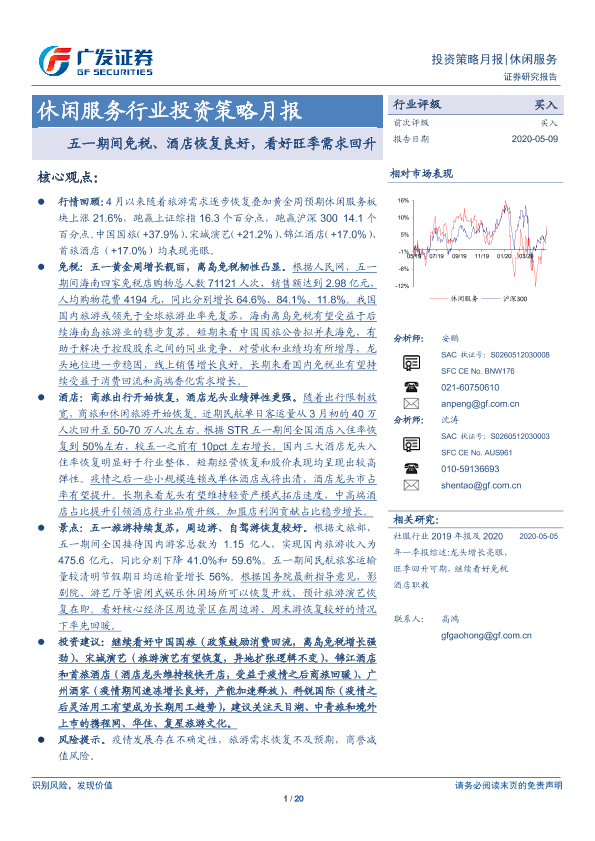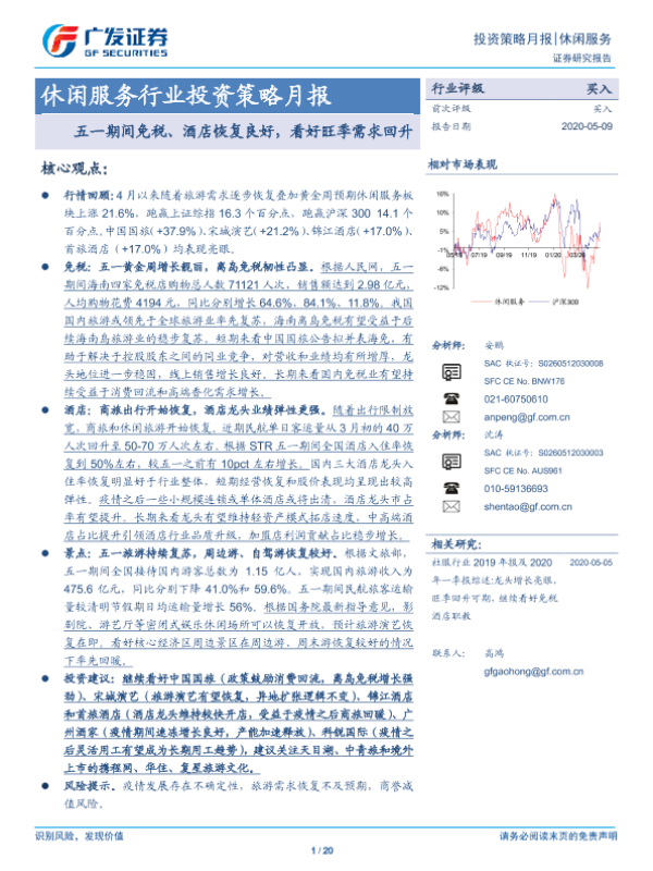 【广发证券】【20200509】休闲服务行业投资策略月报:五一期间免税、酒店恢复良好,看好旺季需求回升-20页