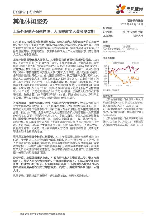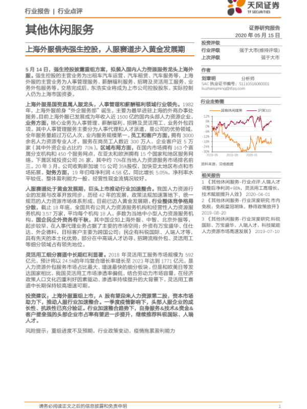 【天风证券】【20200515】其他休闲服务行业点评:上海外服借壳强生控股,人服赛道步入黄金发展期-8页