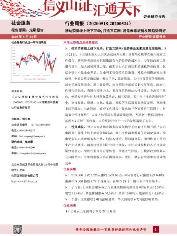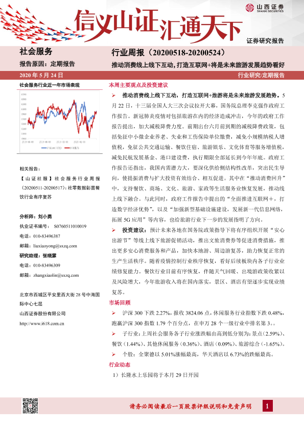 【山西证券】【20200524】社会服务行业周报:推动消费线上线下互动,打造互联网+将是未来旅游发展趋势看好-9页