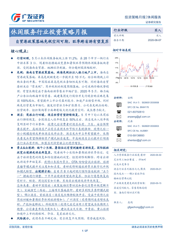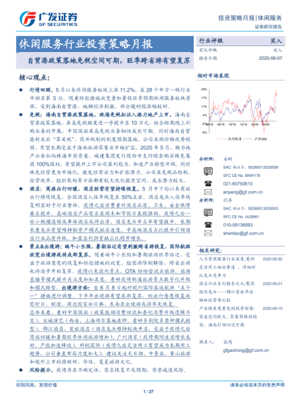 【广发证券】【20200607】休闲服务行业投资策略月报:自贸港政策落地免税空间可期,旺季跨省游有望复苏-27页