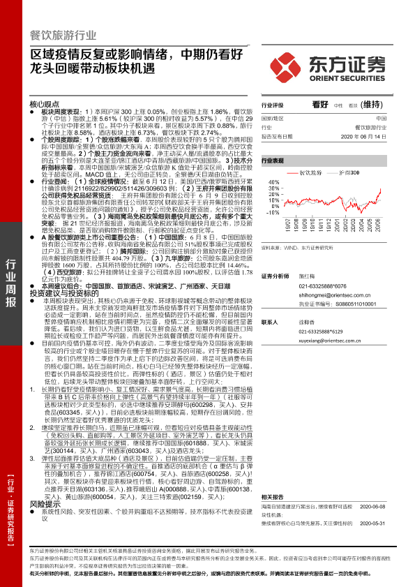 【东方证券】【20200614】餐饮旅游行业周报:区域疫情反复或影响情绪,中期仍看好龙头回暖带动板块机遇-27页
