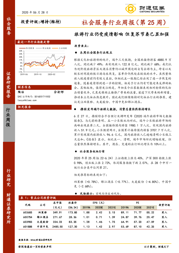 【财通证券】【20200628】社会服务行业周报:旅游行业仍受疫情影响但复苏节奏已显加强-14页