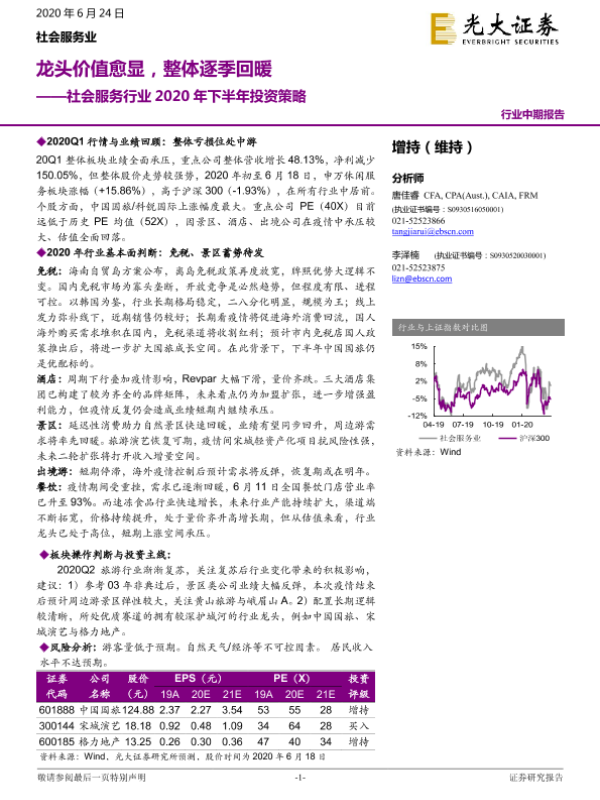 【光大证券】【20200624】社会服务行业2020年下半年投资策略:龙头价值愈显,整体逐季回暖-23页