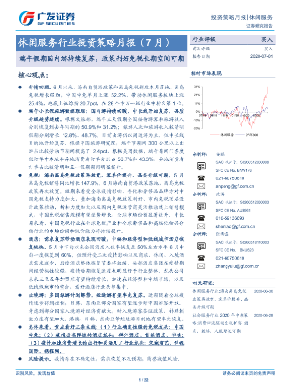 【广发证券】【20200701】休闲服务行业投资策略月报(7月):端午假期国内游持续复苏,政策利好免税长期空间可期-22页