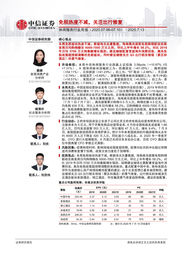【中信证券】【20200713】休闲服务行业周报:免税热度不减,关注出行修复-13页