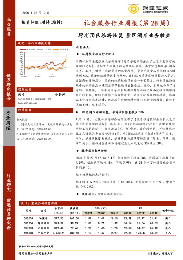 【财通证券】【20200719】社会服务行业周报:跨省团队旅游恢复 景区酒店业务收益-14页