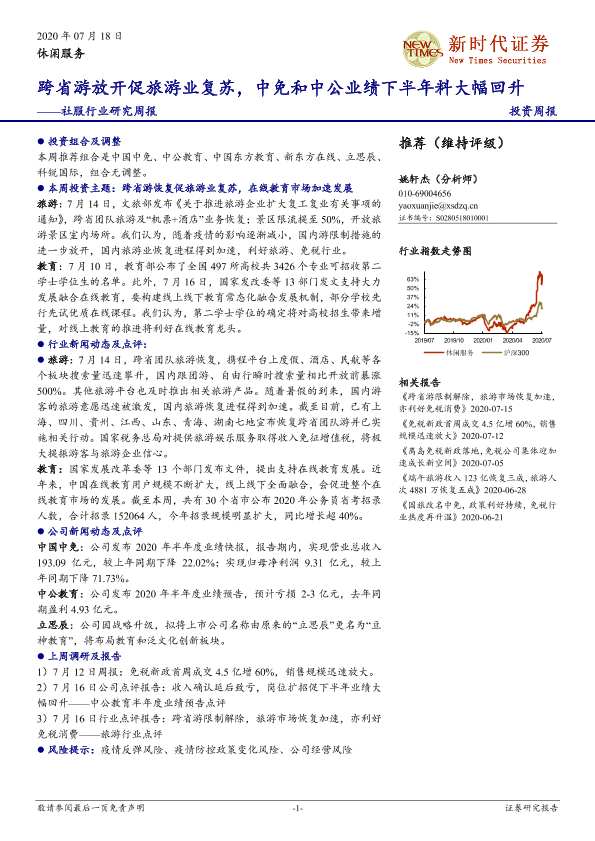 【新时代证券】【20200718】社服行业研究周报:跨省游放开促旅游业复苏,中免和中公业绩下半年料大幅回升-18页