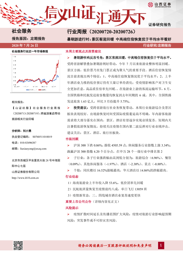 【山西证券】【20200726】社会服务行业周报:暑期游进行时:景区客流回暖 中高端住宿恢复优于平均水平看好-9页