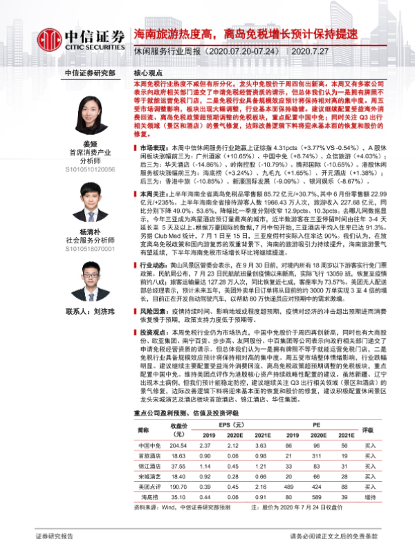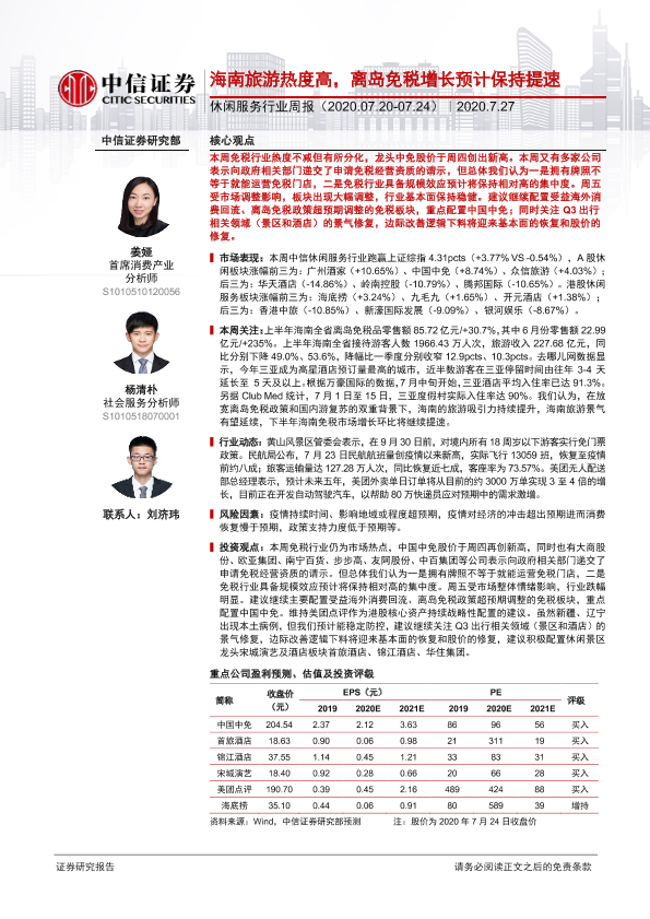 【中信证券】【20200727】休闲服务行业周报:海南旅游热度高,离岛免税增长预计保持提速-13页