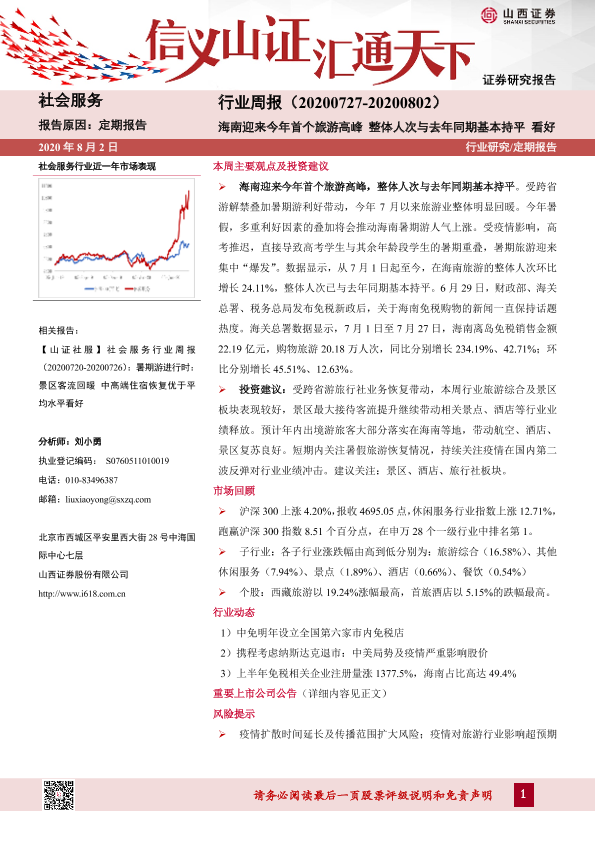 【山西证券】【20200802】社会服务行业周报:海南迎来今年首个旅游高峰 整体人次与去年同期基本持平-8页