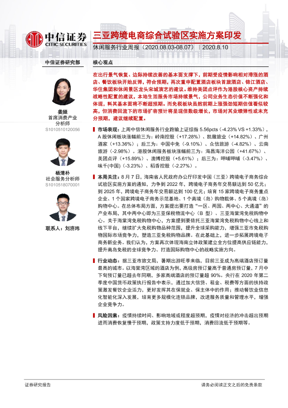 【中信证券】【20200810】休闲服务行业周报:三亚跨境电商综合试验区实施方案印发-14页