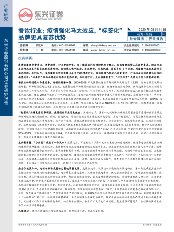 【东兴证券】【20200811】餐饮行业:疫情强化马太效应,“标签化”品牌更具复苏优势-15页