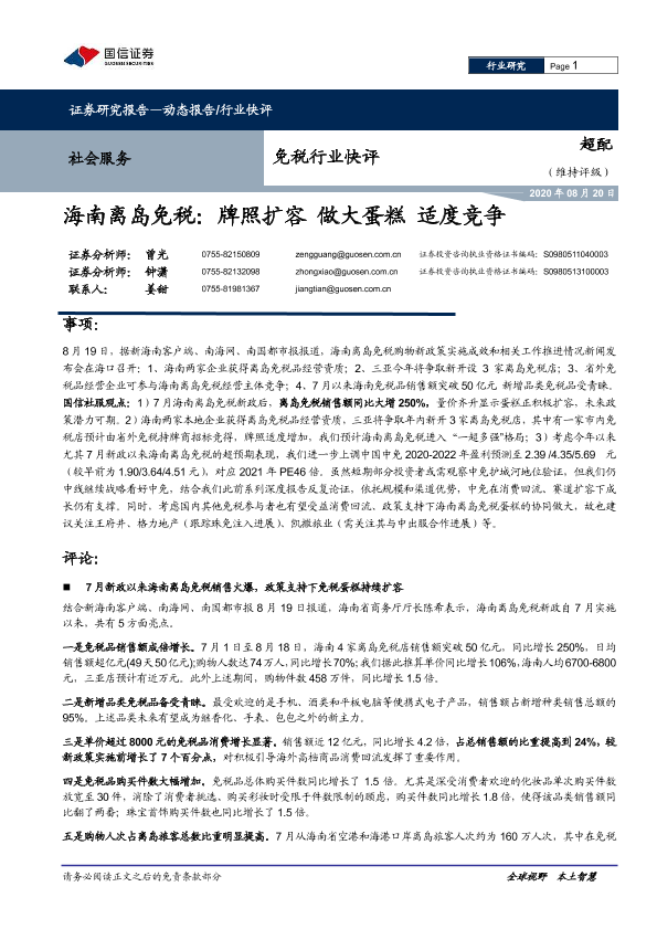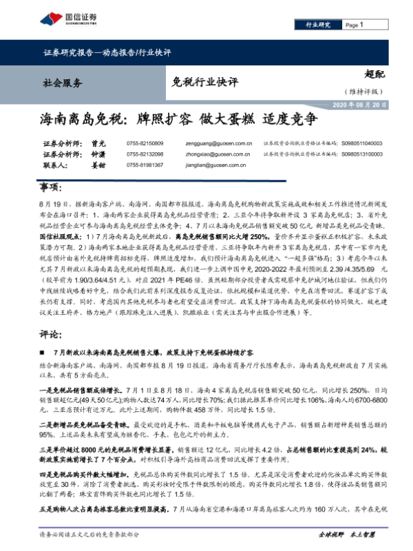 【国信证券】【20200820】海南离岛免税:牌照扩容 做大蛋糕 适度竞争-7页