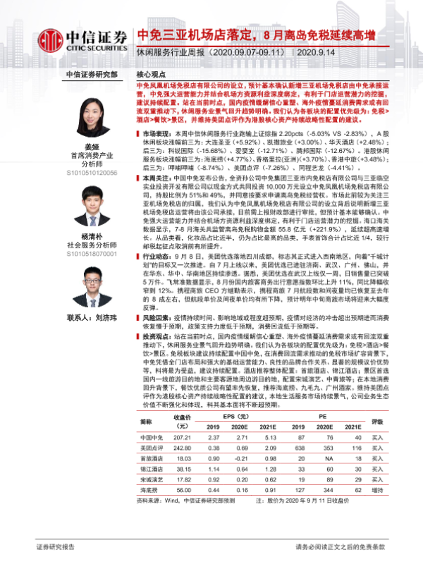 【中信证券】【20200914】休闲服务行业周报:中免三亚机场店落定,8月离岛免税延续高增-13页