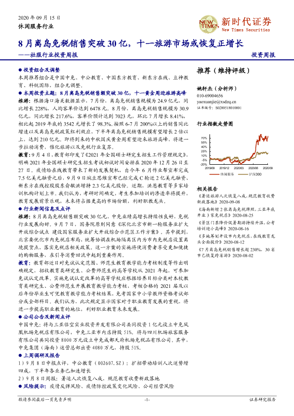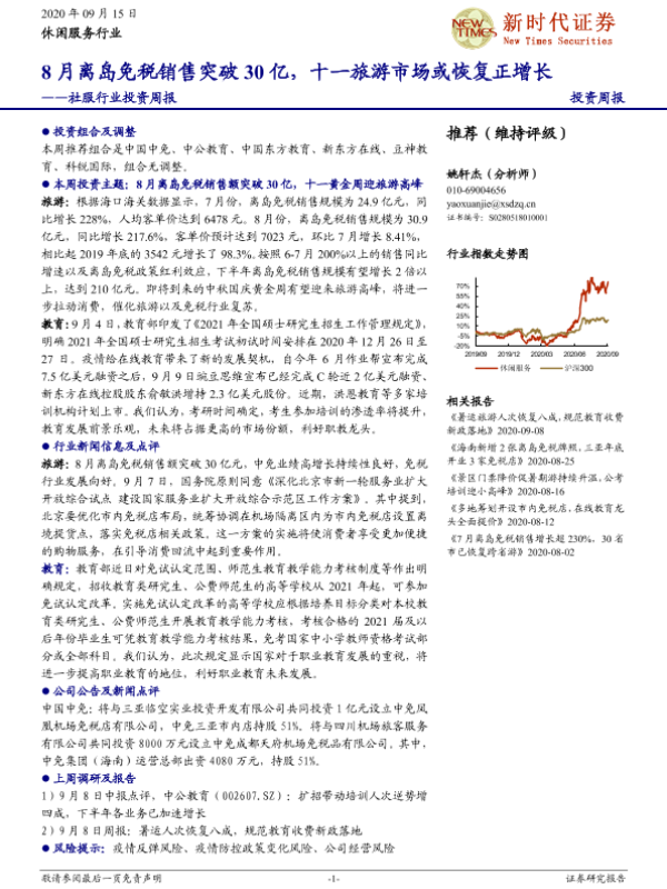 【新时代证券】【20200915】社服行业投资周报:8月离岛免税销售突破30亿,十一旅游市场或恢复正增长-19页