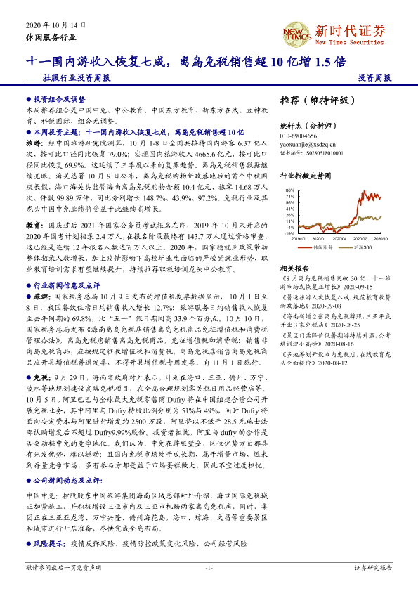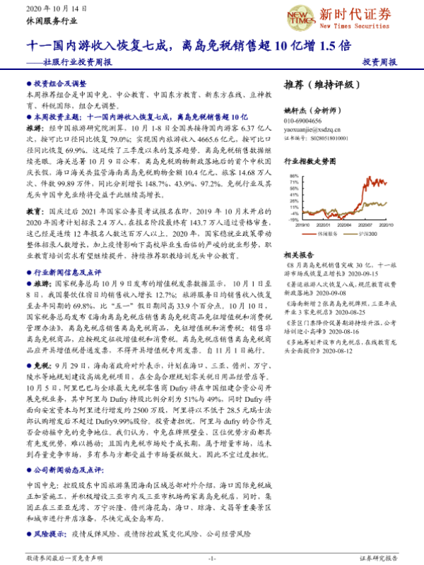 【新时代证券】【20201014】社服行业投资周报:十一国内游收入恢复七成,离岛免税销售超10亿增1.5倍-19页
