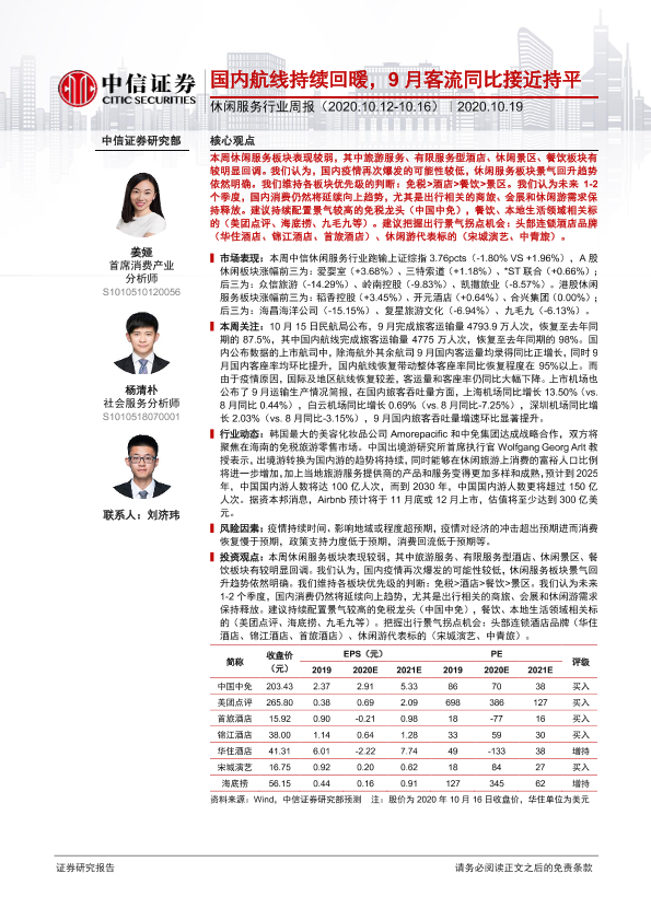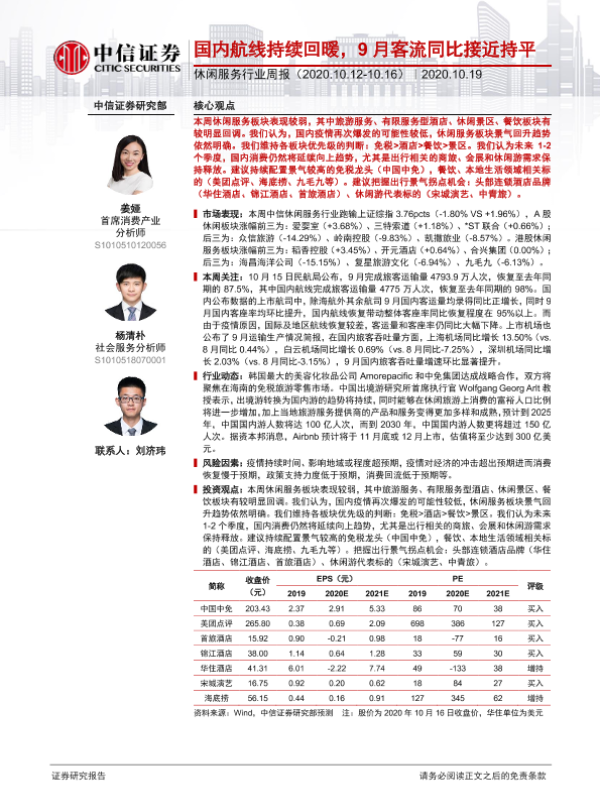 【中信证券】【20201019】休闲服务行业周报:国内航线持续回暖,9月客流同比接近持平-13页