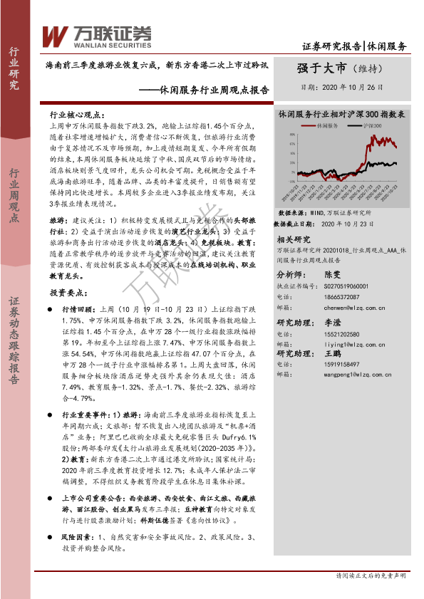 【万联证券】【20201026】休闲服务行业周观点报告:海南前三季度旅游业恢复六成,新东方香港二次上市过聆讯-9页
