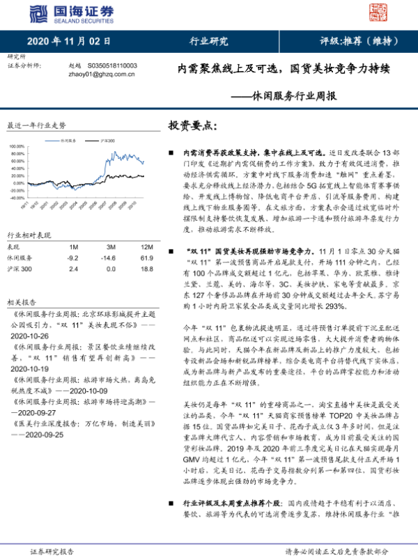 休闲服务 内需消费 双11 国货美妆 政策支持