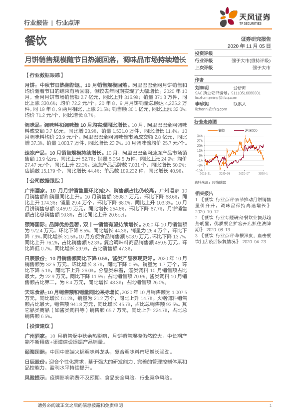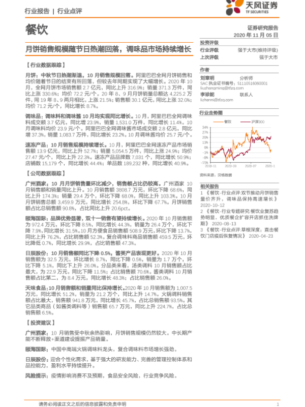 【天风证券】【20201105】餐饮行业:月饼销售规模随节日热潮回落,调味品市场持续增长-9页