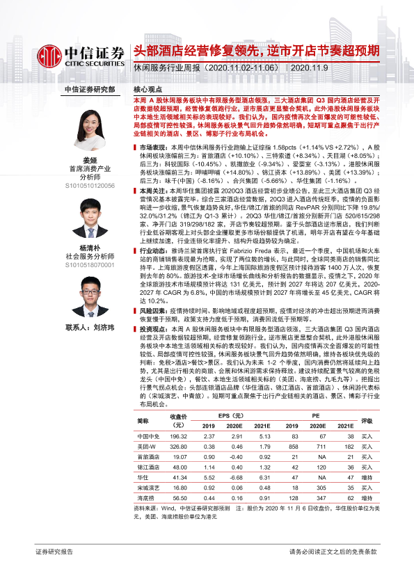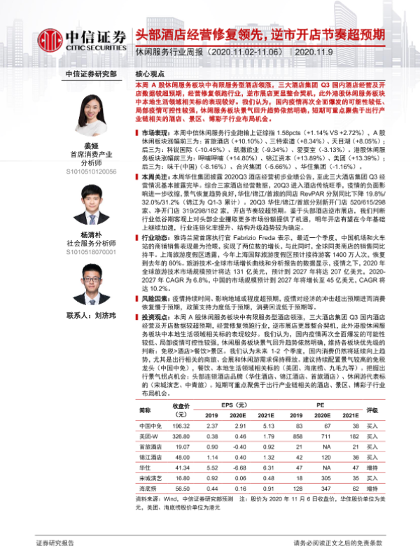 【中信证券】【20201109】休闲服务行业周报 头部酒店经营修复领先,逆市开店节奏超预期-15页